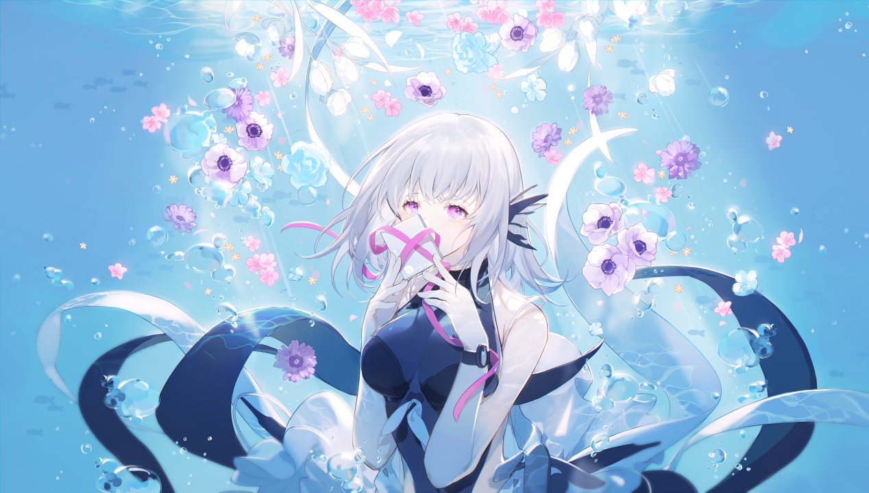 美雪、原创、人物、女孩、动漫、银发、肖像、鲜花、水下、素描、插图、AI艺术