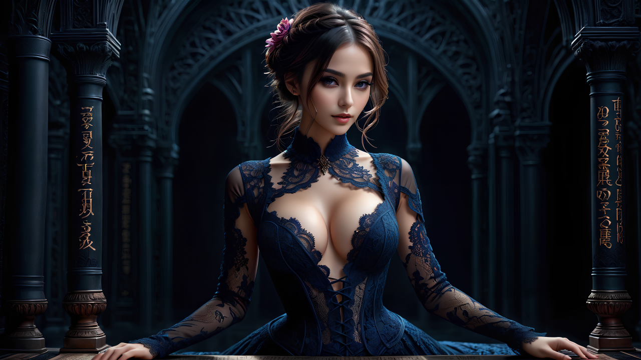 女性、短发、嘴唇、艺术、AI艺术、女孩、女人、盘发、柱子、栏杆