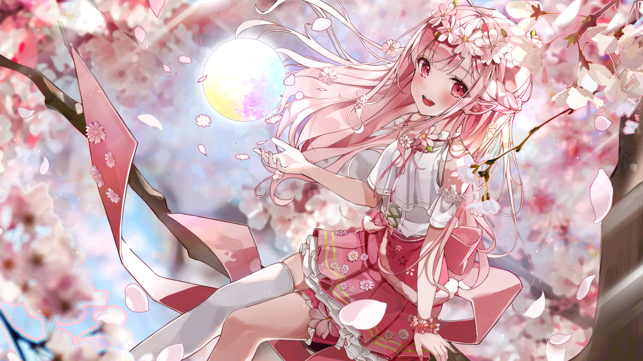 红色眼睛、樱花、舞女、动漫、女孩、花瓣
