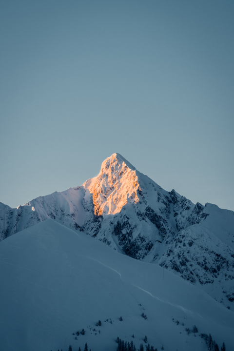 风景、天空、阳光、日落、雪、环境、树木、森林、冬天、橙色天空、山顶
