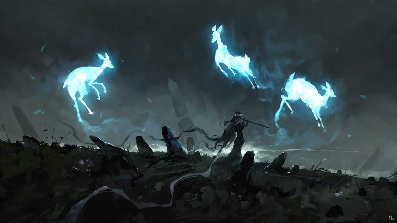 神秘夜晚中的精灵与鹿