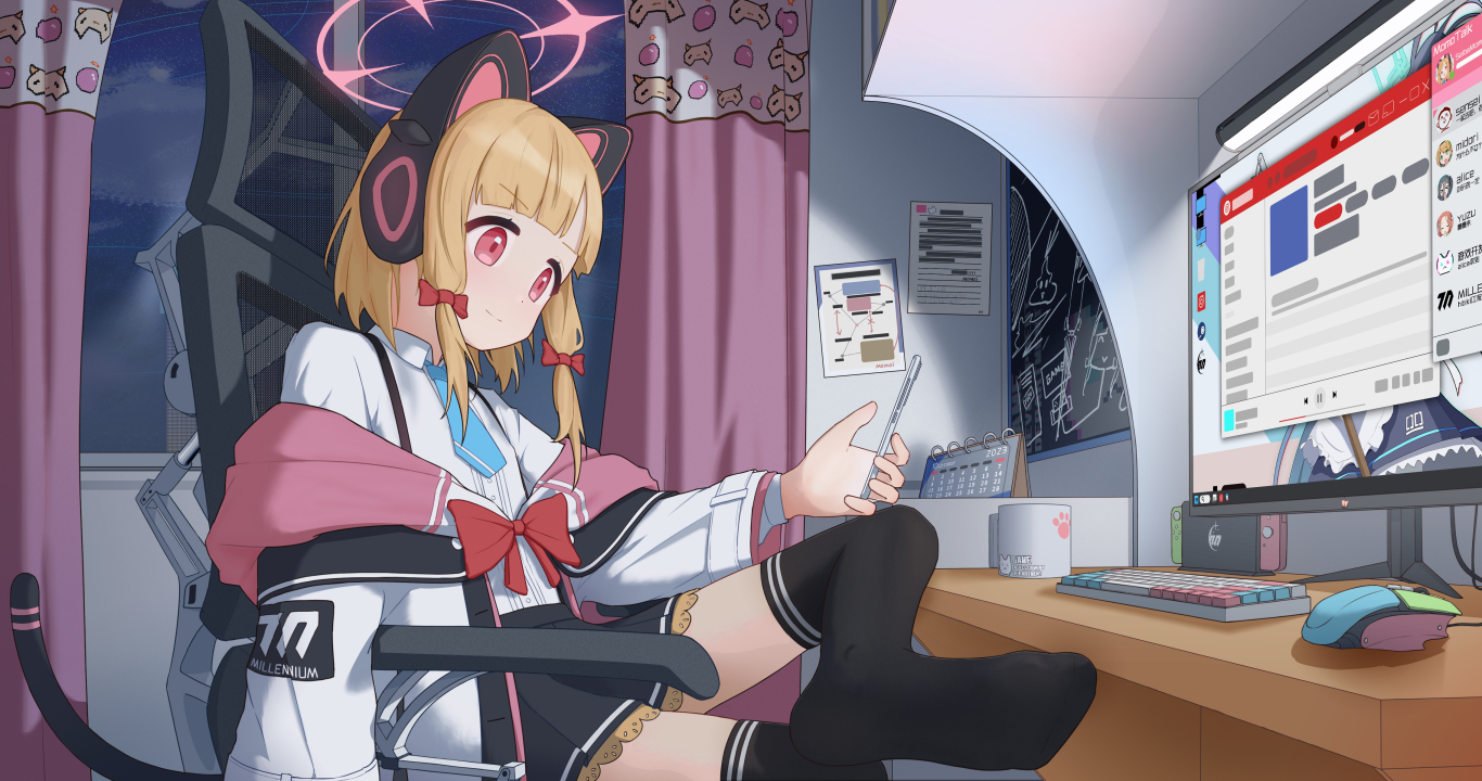 金发、女郎、猫女、室内、微笑、女学生、蓝色档案、动漫、游戏、动漫女孩、校服、猫耳朵、耳机、猫尾巴、窗户、电脑、键盘、袜子