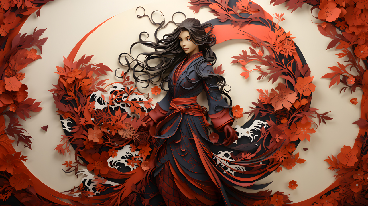 长发、AI艺术、剪纸、树叶、鲜花、红色