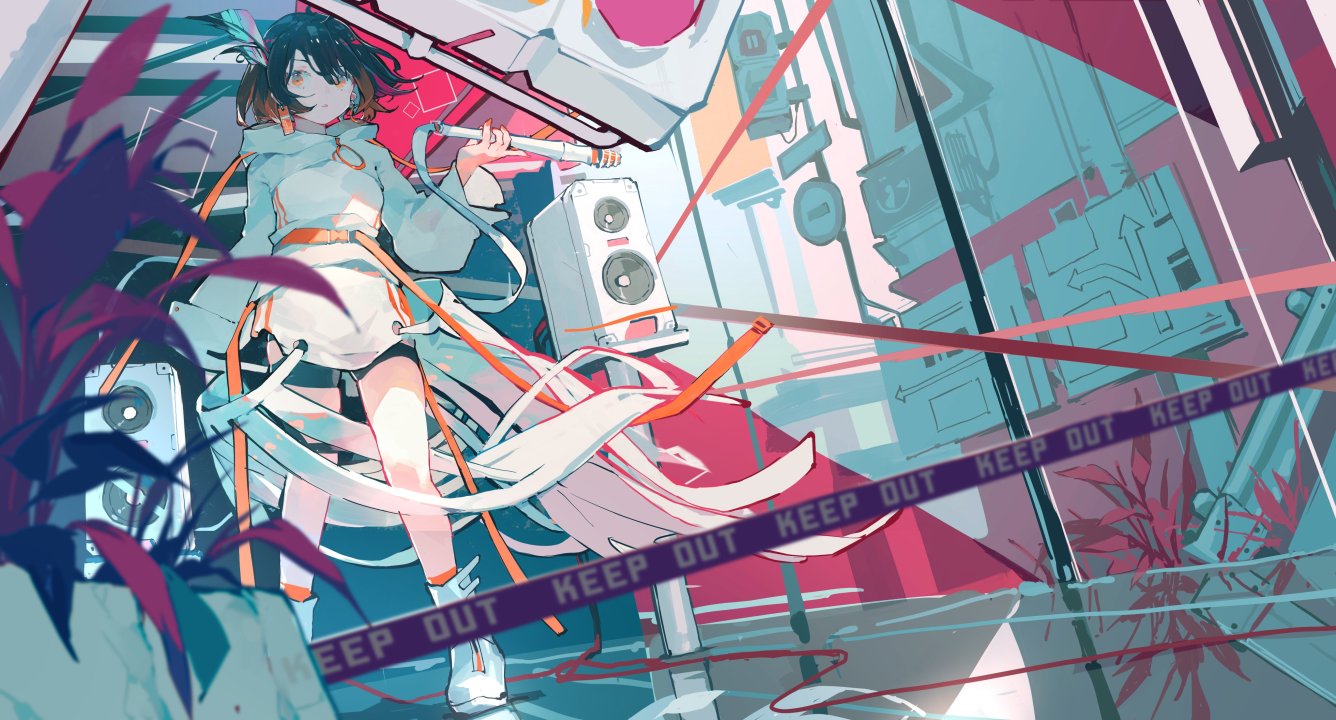 短发、深色头发、女孩、动漫、丝带、扬声器