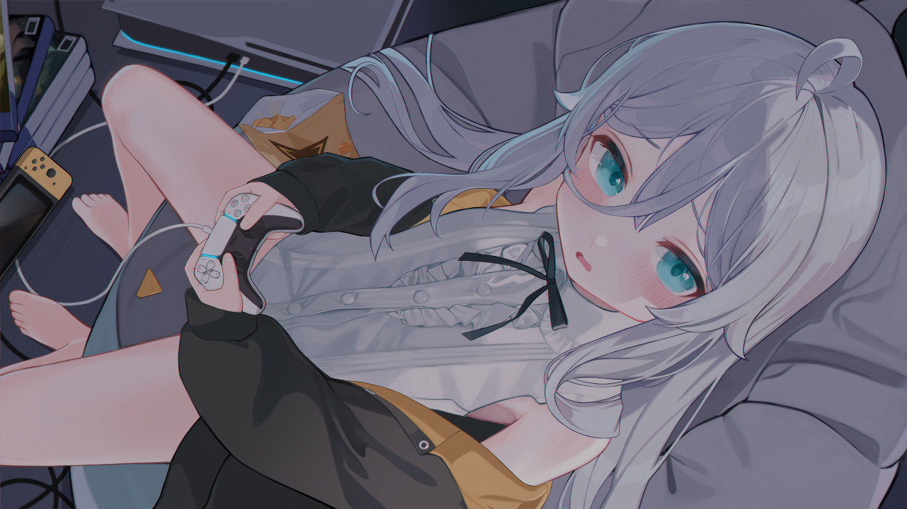 长发、白发、蓝眼睛、动漫、女孩、围巾、手套、耳机、科技、室内、台灯