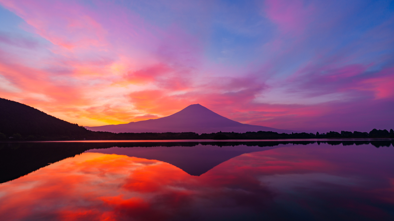 自然、风景、山脉、湖泊、倒影、树木、云、天空、粉红色云、橙色云、湖