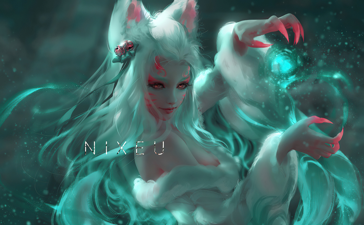 AHRI(英雄联盟)、视频游戏角色、狐狸耳朵、狐狸耳朵、尾巴、看观众、雪月(英雄联盟)、雪月、英雄联盟、数字艺术、暴走游戏、gzg、k、视频游戏、视频游戏艺术、狐狸女孩、狐女
