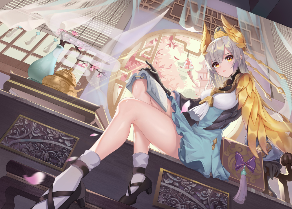 坐着、高跟鞋、刘海、弯曲的腿、动漫女孩、连衣裙、袜子、绿色袜子、短袜子、灰色袜子、鞋子、黑色高跟鞋、蓝色连衣裙、手套