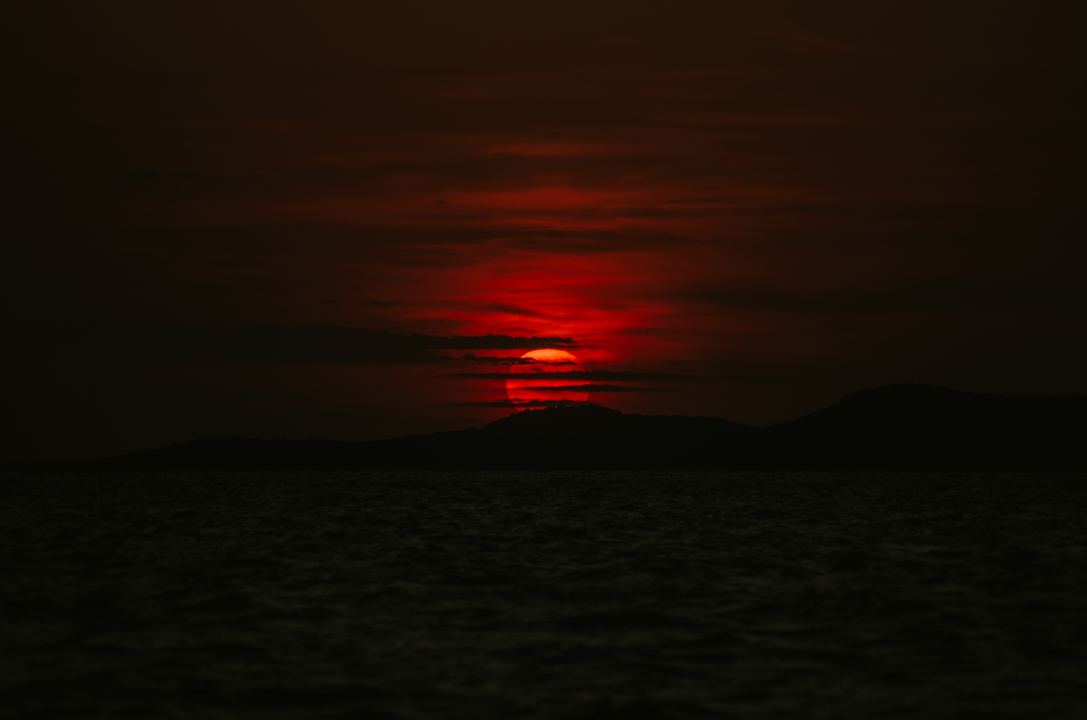 山脉、红日、黑暗、日落、太阳、大海、户外