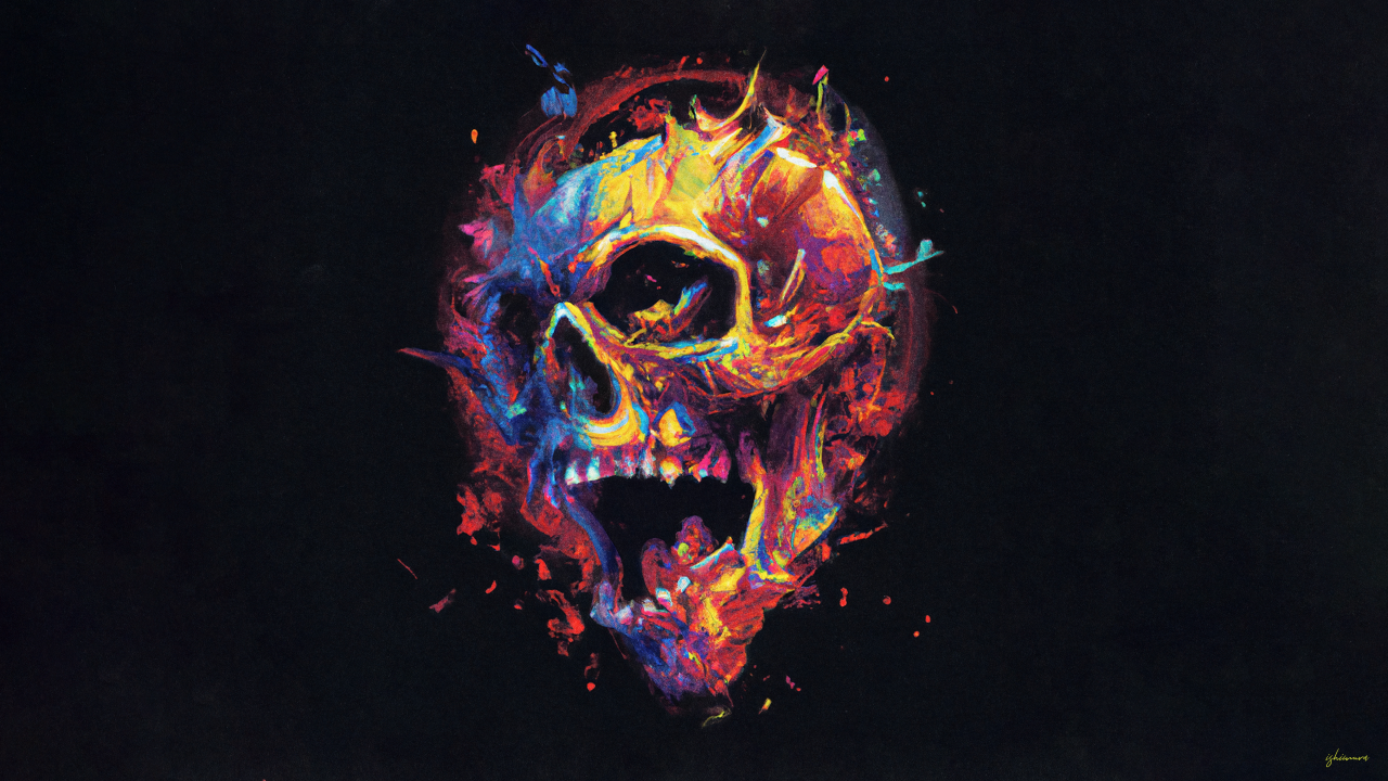 骷髅、抽象、彩色、黑色、原图、AI艺术、插图、喷雾、平面设计、简单背景、极简主义、黑色背景