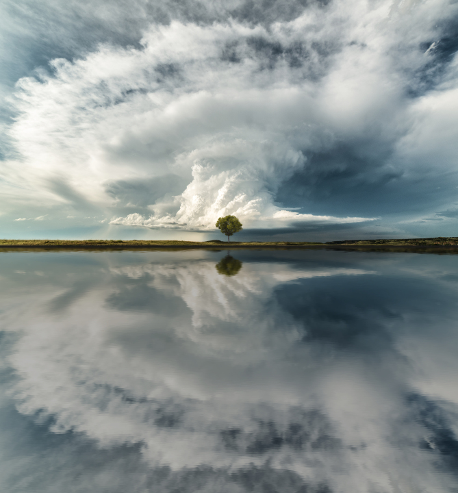 宁静的湖面倒映着天空的云朵