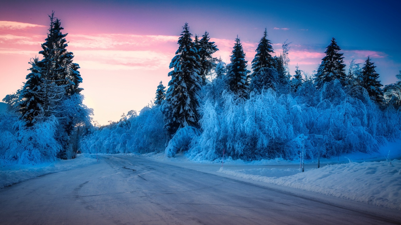 冬天、户外、冰、寒冷、雪、道路、紫色天空、阳光
