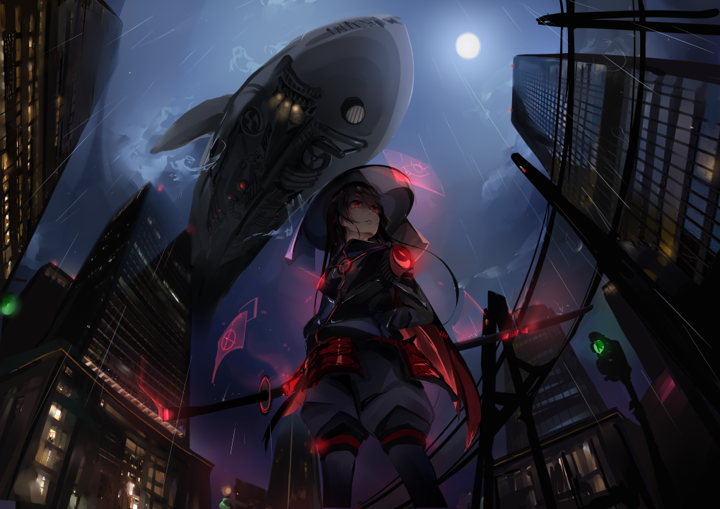 黑发、剑、武士、月亮、武器、飞艇、鲸鱼、动漫、女孩、黑色背景、霓虹灯、城市、赛博朋克、未来主义