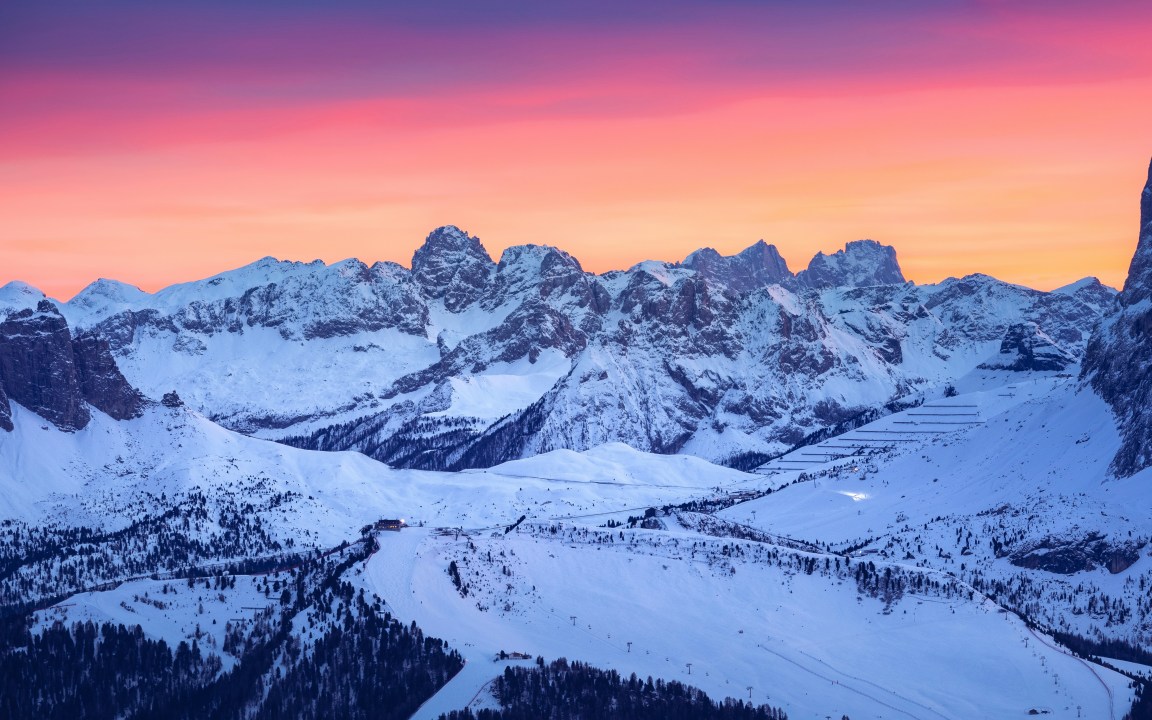 风景、天空、阳光、日落、雪、环境、树木、森林、冬天、橙色天空、山顶