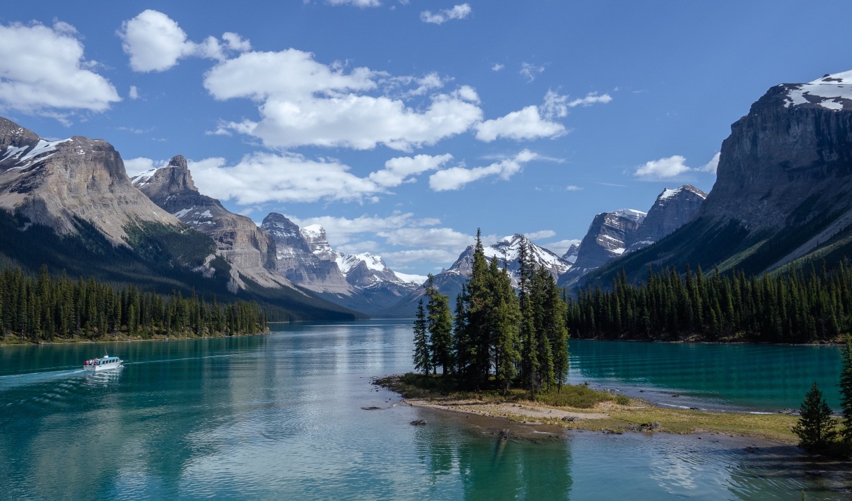 风景、自然、山脉、雪山、松树、森林、岛屿、湖泊、云、船、公园