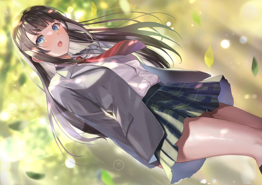 腿、长发、深色头发、蓝眼睛、裙子、动漫、女孩、校服