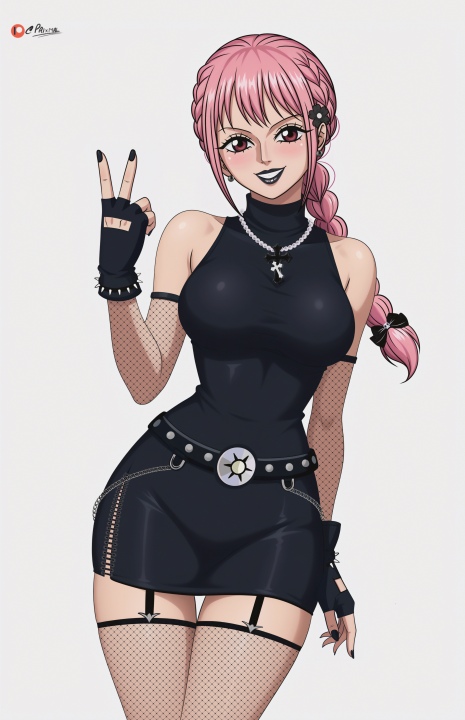 长发、粉色头发、微笑、动漫、丽贝卡、同人、女孩、海贼王、黑色衣服、项链、连衣裙、白色背景、丝袜