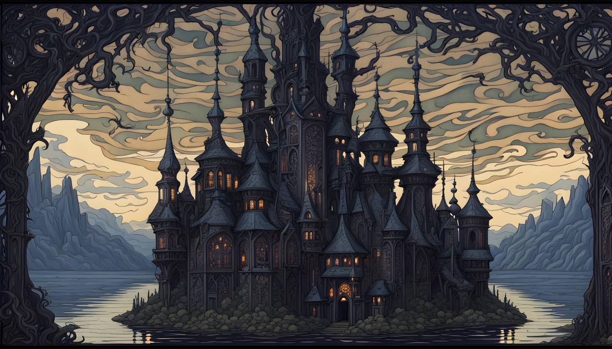 城堡、幻想城堡、故事书、边界、云、湖、人工智能艺术