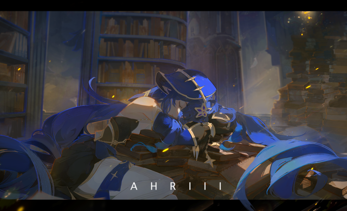 蓝发、长发、闭眼、原神、动漫、女孩、头饰、图书馆、书籍、兽耳