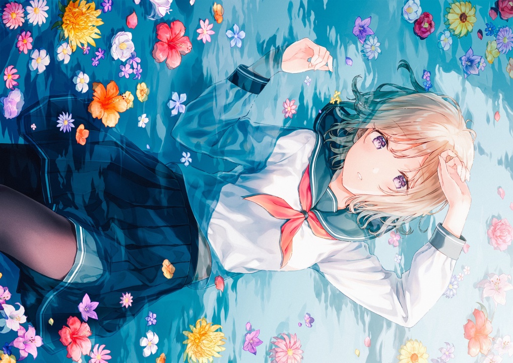 原创人物、金发、仰卧、动漫、动漫女孩、紫色眼睛、水中、校服、水手、制服
