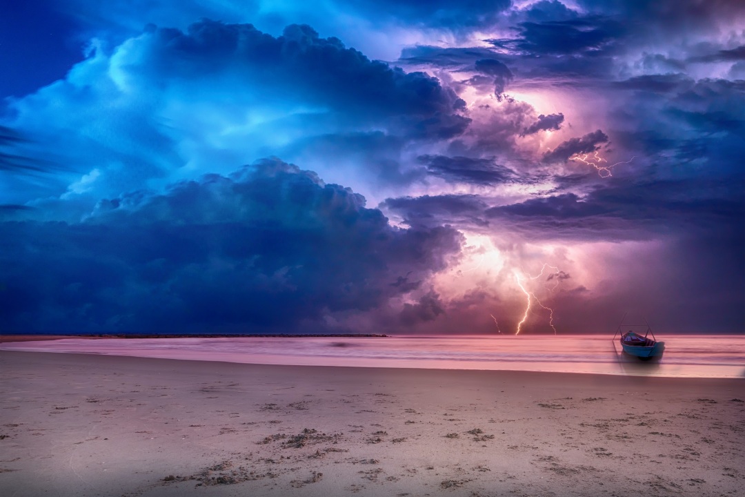 闪电、自然、大海、海滩、船、天空、云、风暴