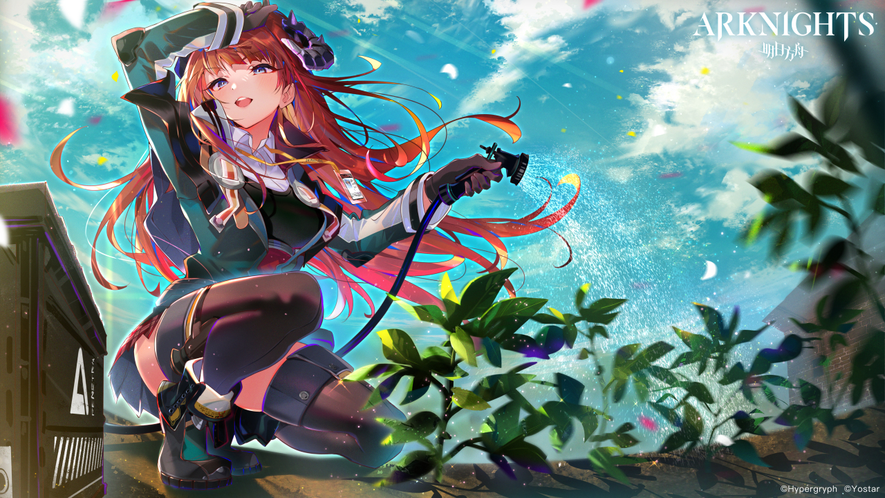 黑发、蓝眼睛、蹲着、动漫、女孩、神枪手、风笛、号角、植物