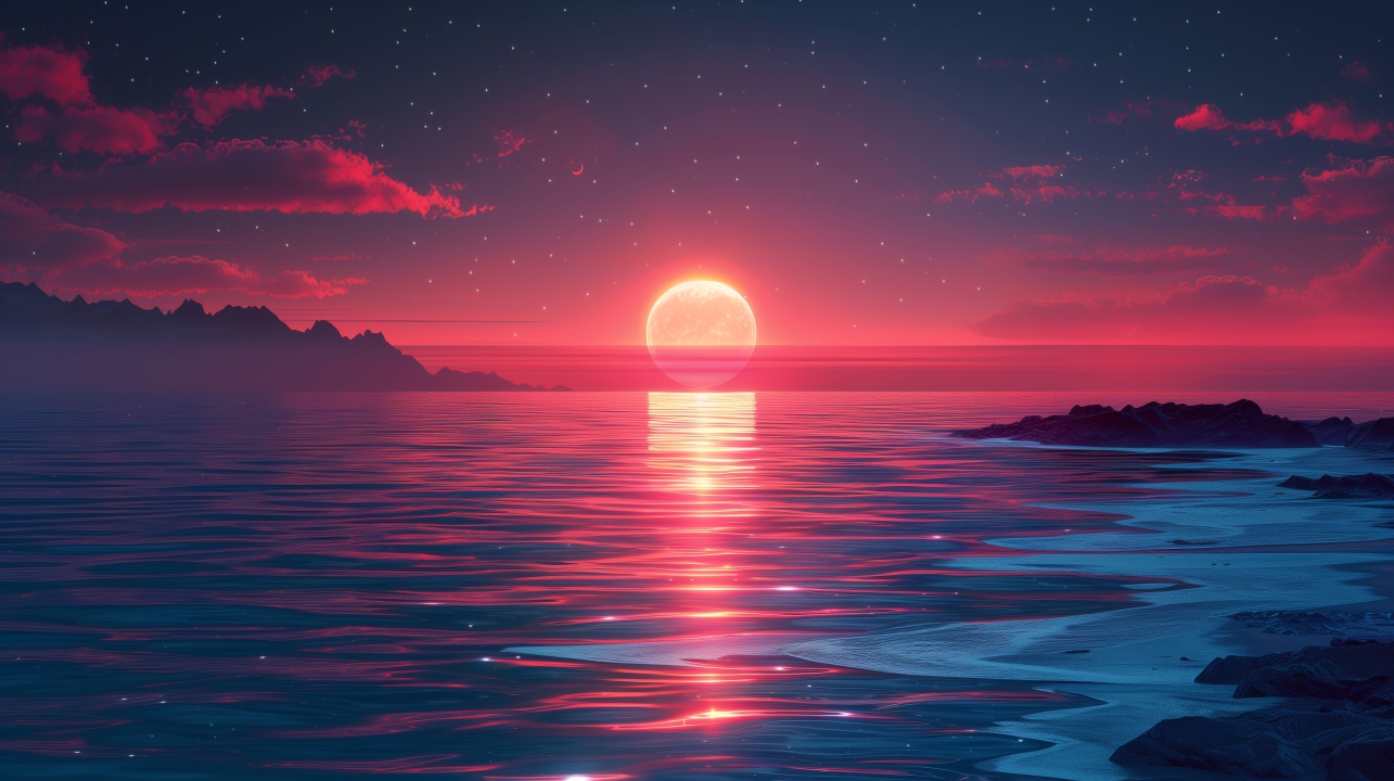 日落、逆波、合成波、复古主题、复古风格、AI艺术、简单背景、棕榈树、反射