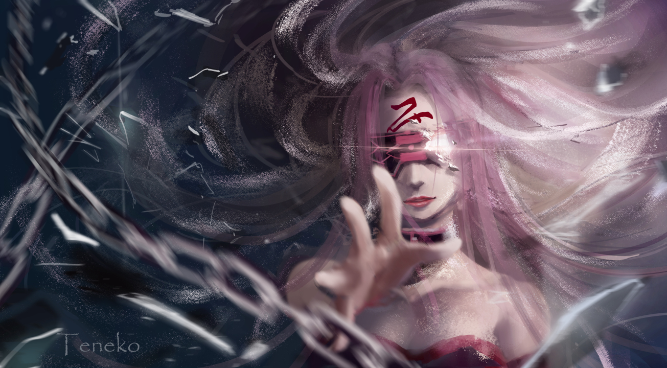 长发、紫色头发、命运、天堂、动漫女孩、锁链、眼罩、骑手