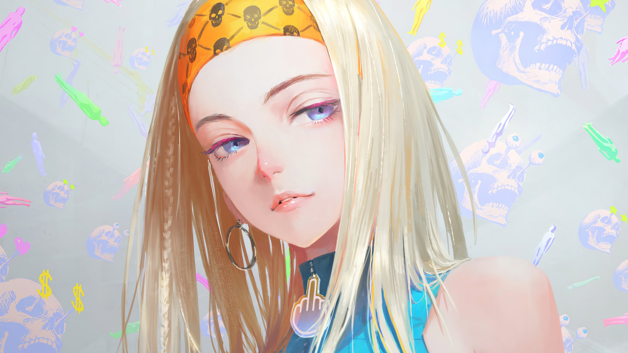 蓝眼睛、金发、横山、动漫女孩、数字艺术、发带、剪裁、艺术品、嬉皮士、骷髅