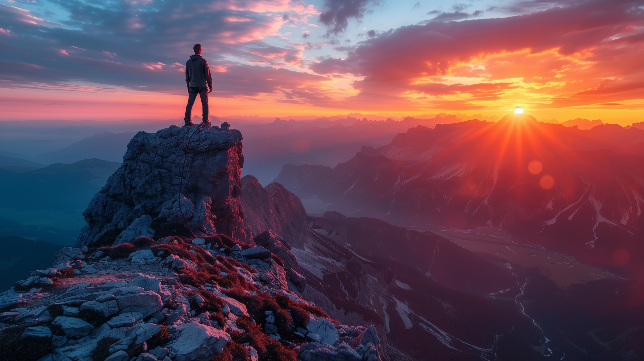 站立、人工智能艺术、剪影、山顶、山景、日落、日出、云、山