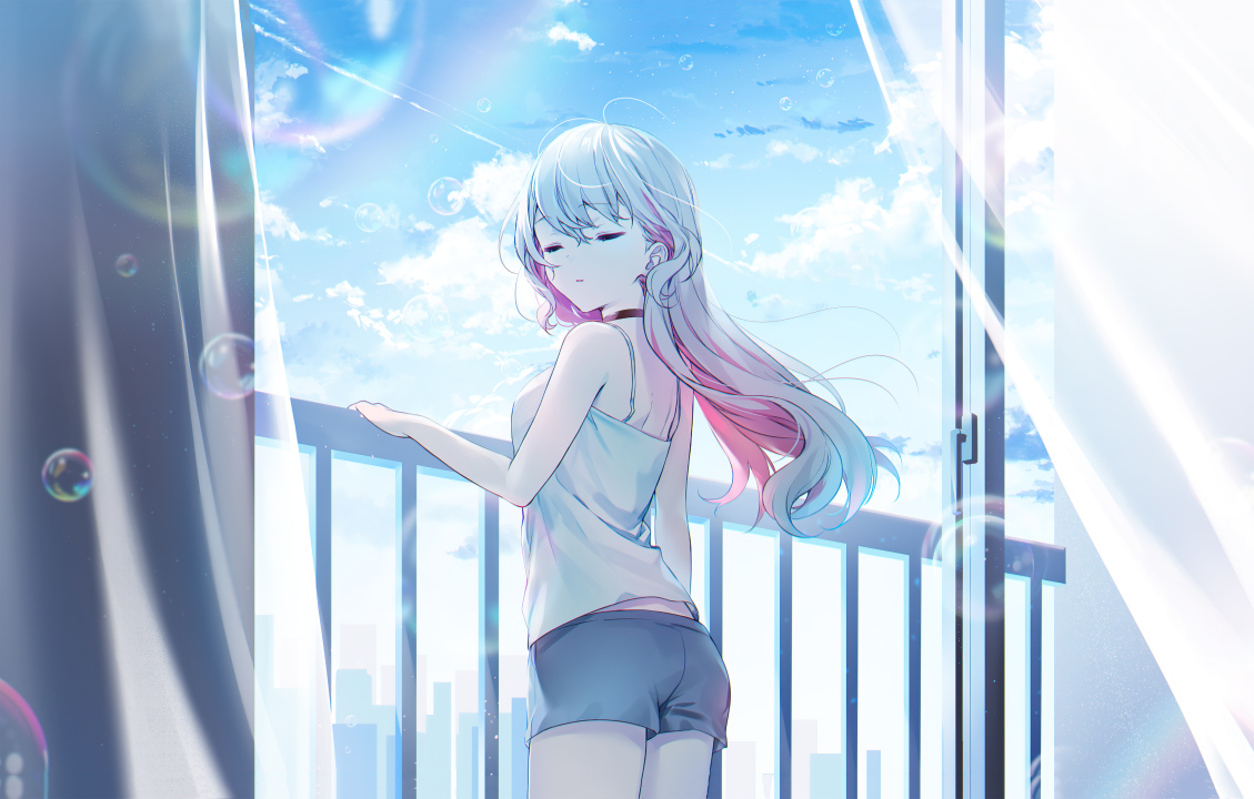 长发、白发、闭眼、动漫、女、天空、云彩、背心、短裤