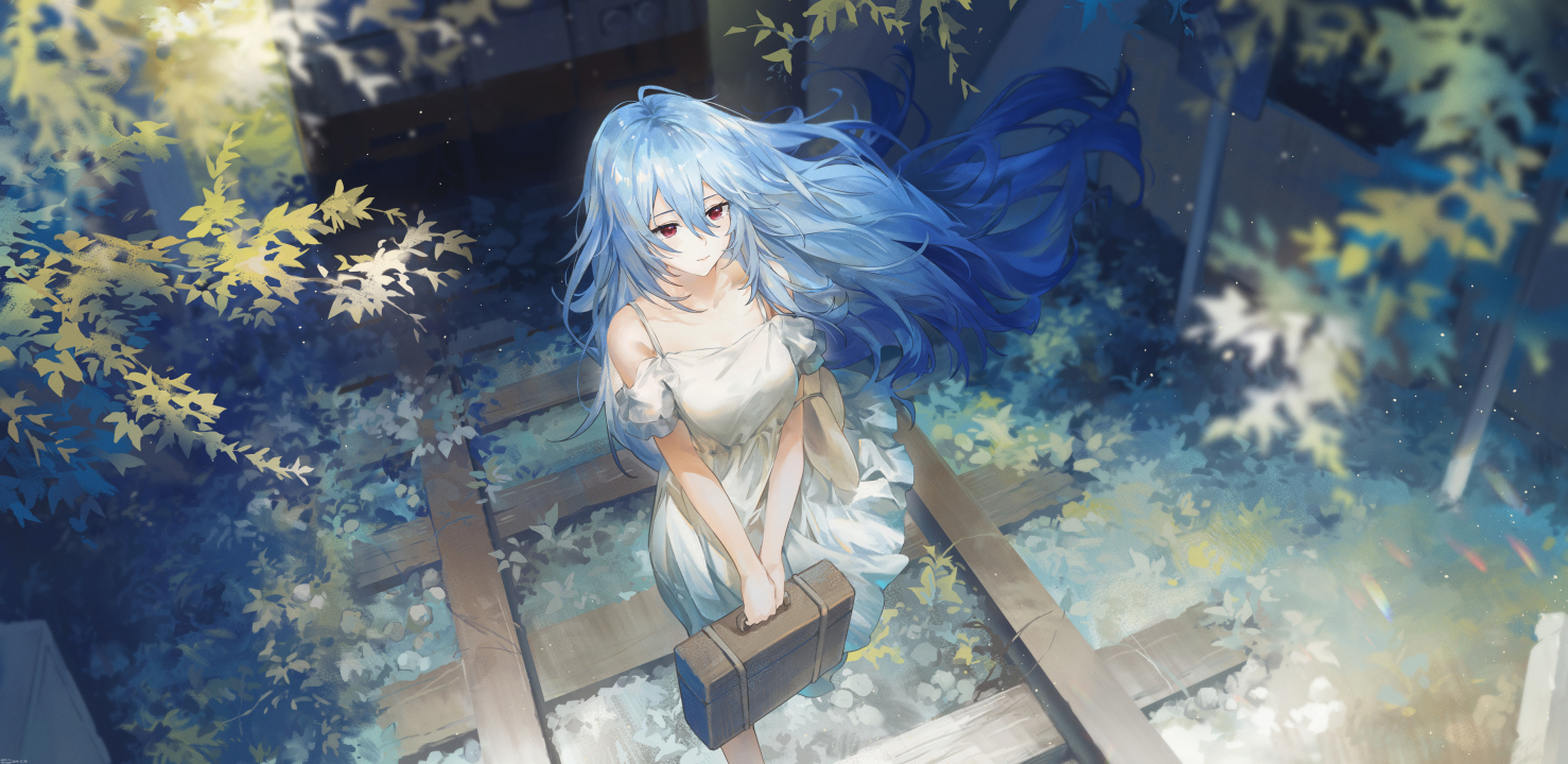 蓝头发、红眼睛、衣服、铁路、手提箱、动漫、动漫女孩