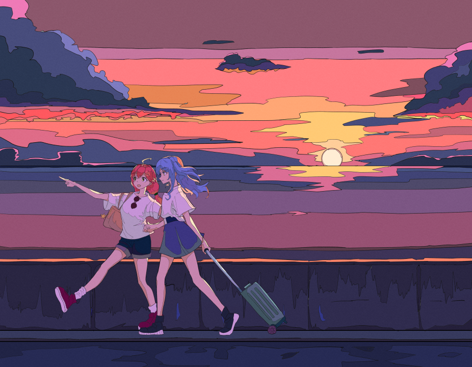 长发、蓝色头发、粉色头发、女孩、动漫、动漫女孩、虚拟、天空、太阳