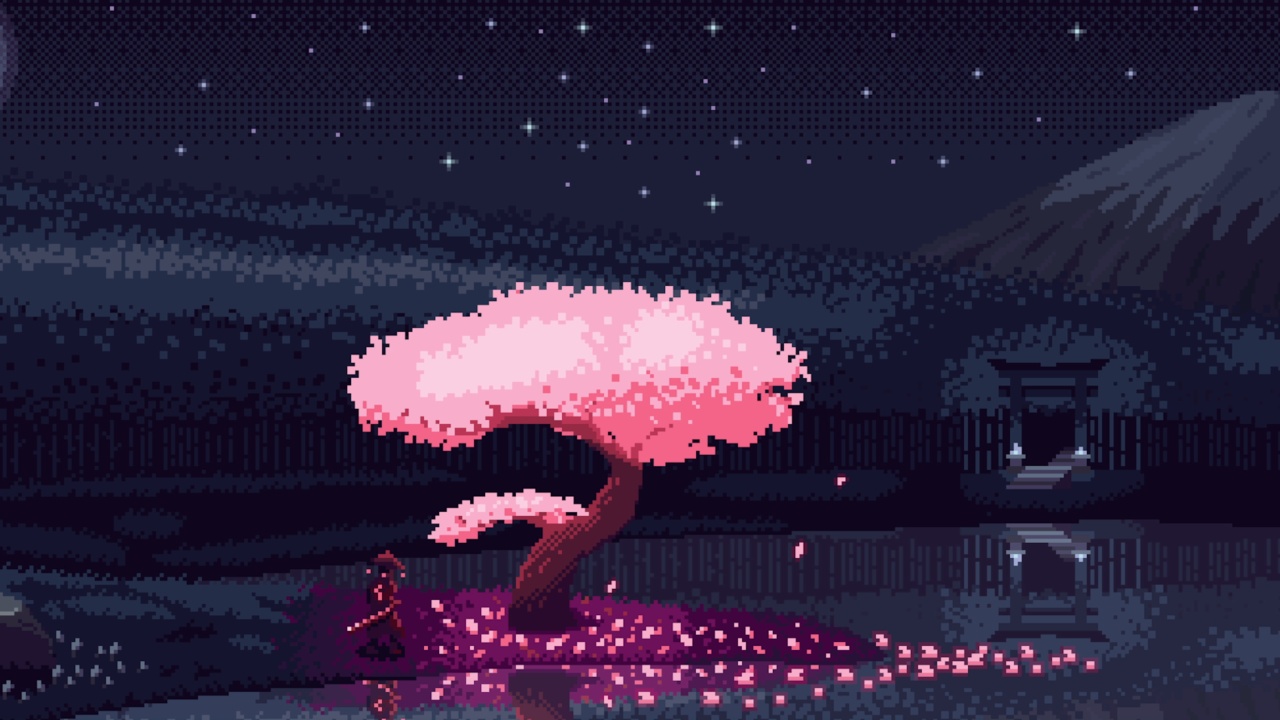 像素风的樱花树与宁静的河流