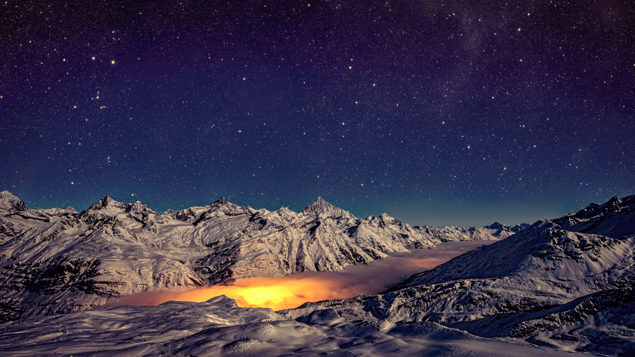 风景、自然、山脉、全景、夜晚、星星、雪、长相、薄雾