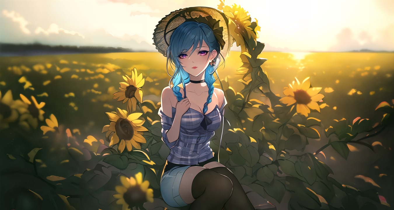 蓝头发、辫子、动漫女孩、动漫、艺术品、数字艺术、米娅、人工智能艺术、鲜花、向日葵、紫色眼睛、项链、袜子