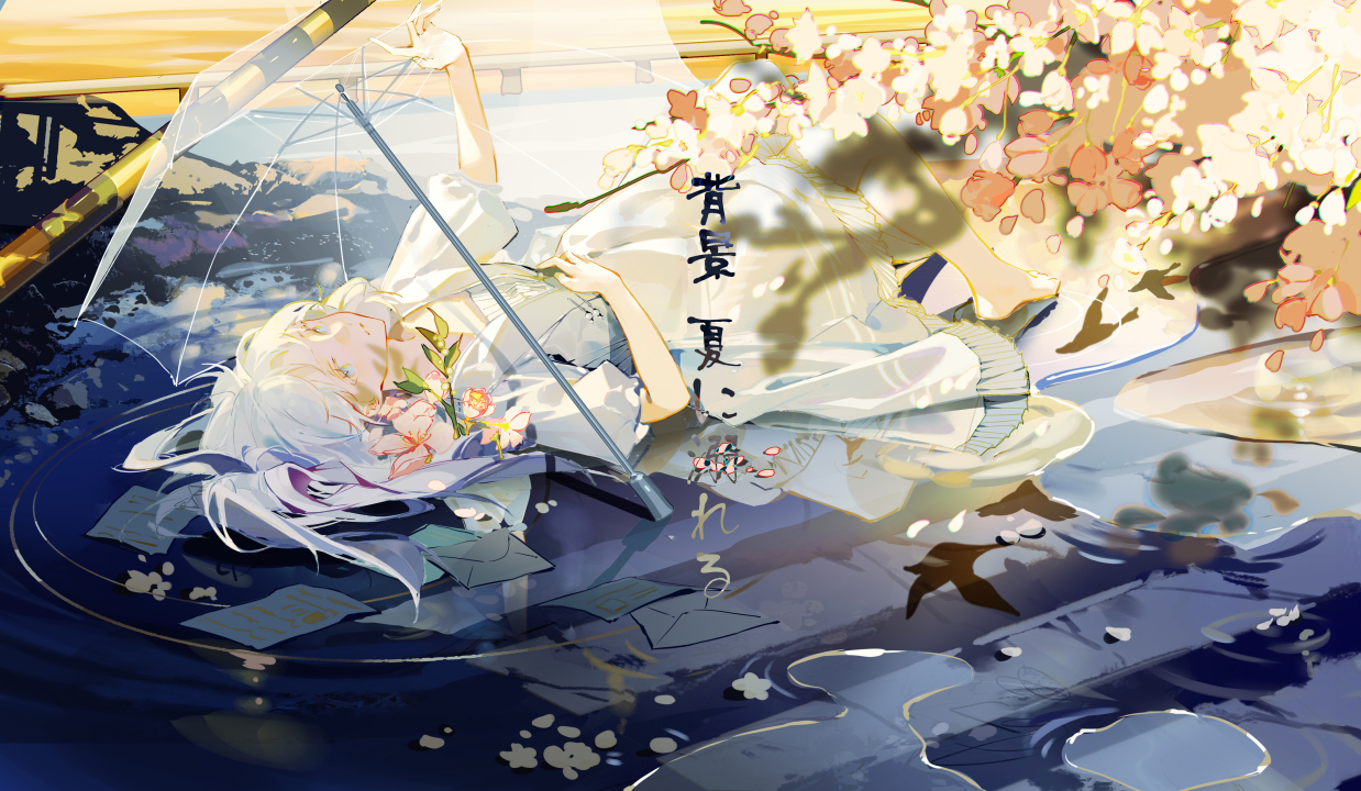 雪子、白发、躺着、动漫、女孩、插图、白色、连衣裙、鲜花、日语