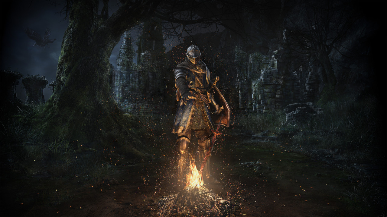 骑士、黑暗灵魂、游戏CG、火、树、夜、城堡
