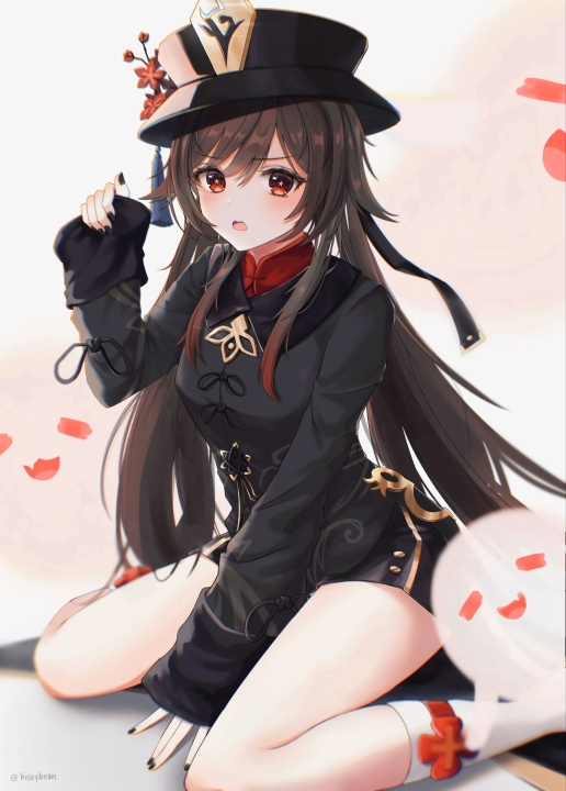 胡桃、原神、大豆、深色头发、红眼睛、长发、跪着、动漫、女孩