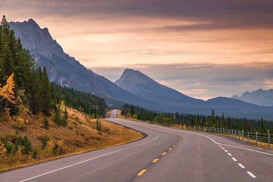 道路、自然、森林、秋天、山脉、风景、天空、云、雪