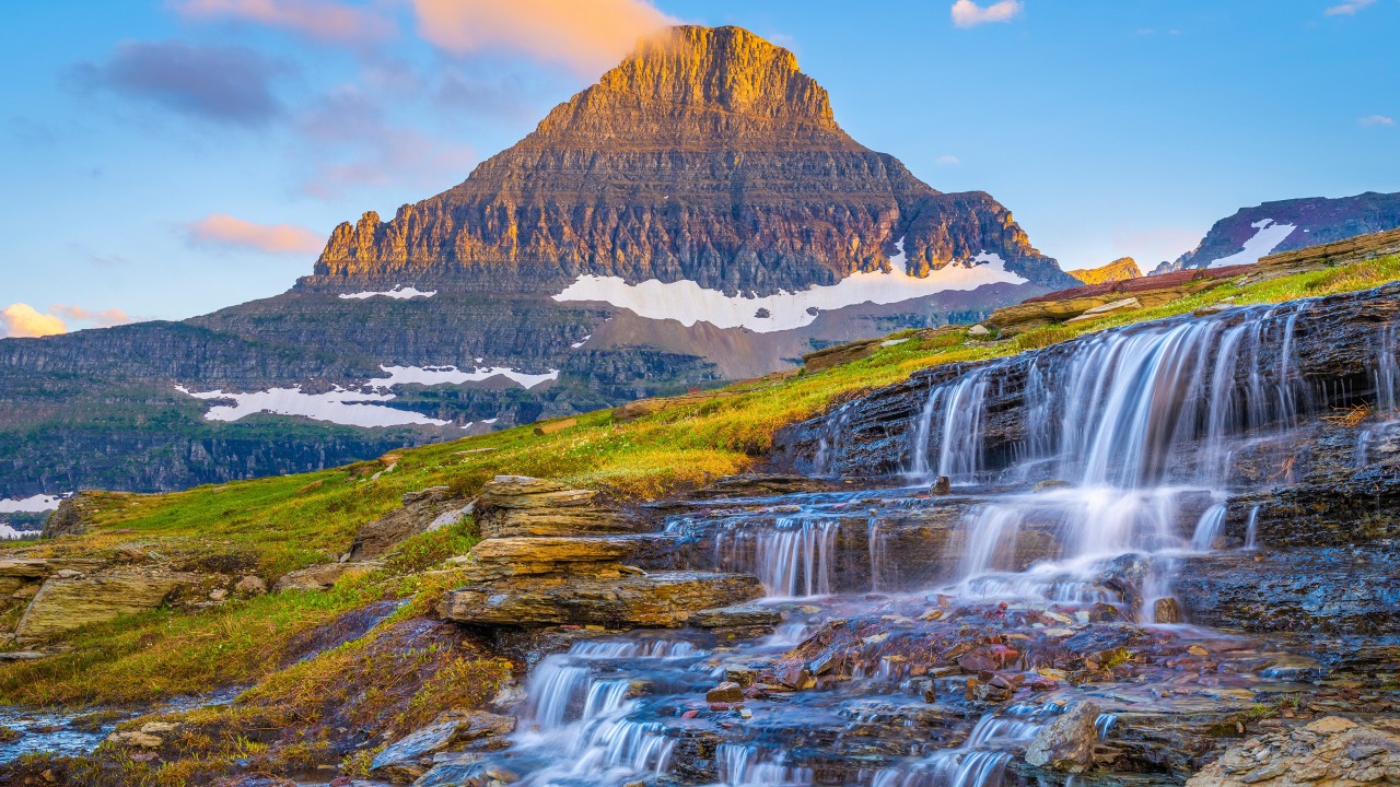 自然、风景、山脉、天空、瀑布、岩石、雪、夕阳、辉光、水、云