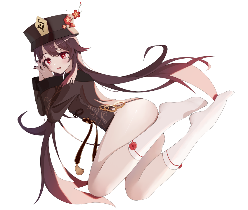 胡桃、原神、红眼睛、动漫少女、白色背景、帽子、大腿、袜子