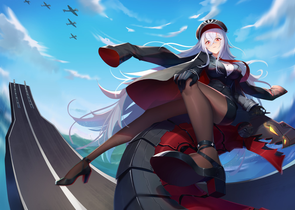 长发、白头发、红眼睛、脚、飞艇、蔚蓝巷、动漫女孩、制服、天空、云、帽子、高跟鞋、裤袜、手套、飞机、军舰、水、夹克