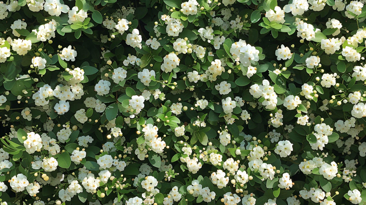 春日繁花:白色花朵与翠绿叶子交织的美丽画卷”