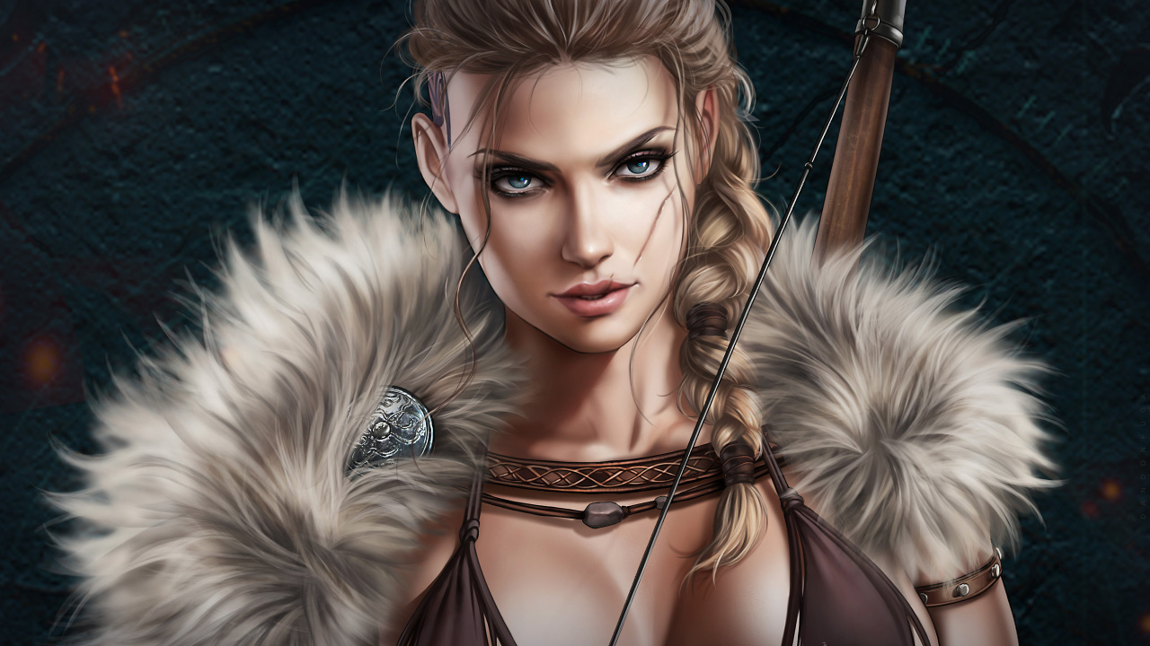 战士、奇幻女孩、金发女郎、女人、AI艺术、皮毛、黑色背景、特写、刺客的信条