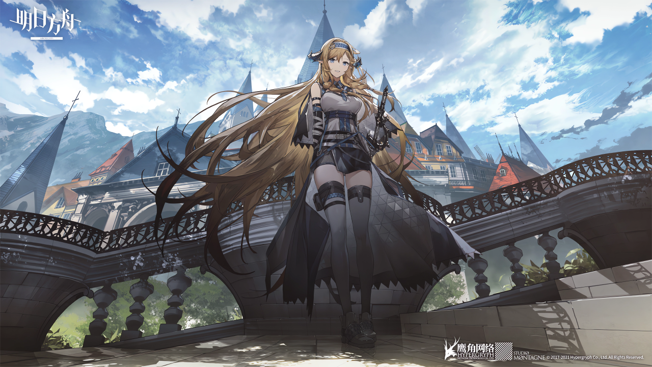 长发、金发、蓝眼睛、女人、飘扬、动漫、动漫女孩、骑、天空、云、建筑、山、阳光