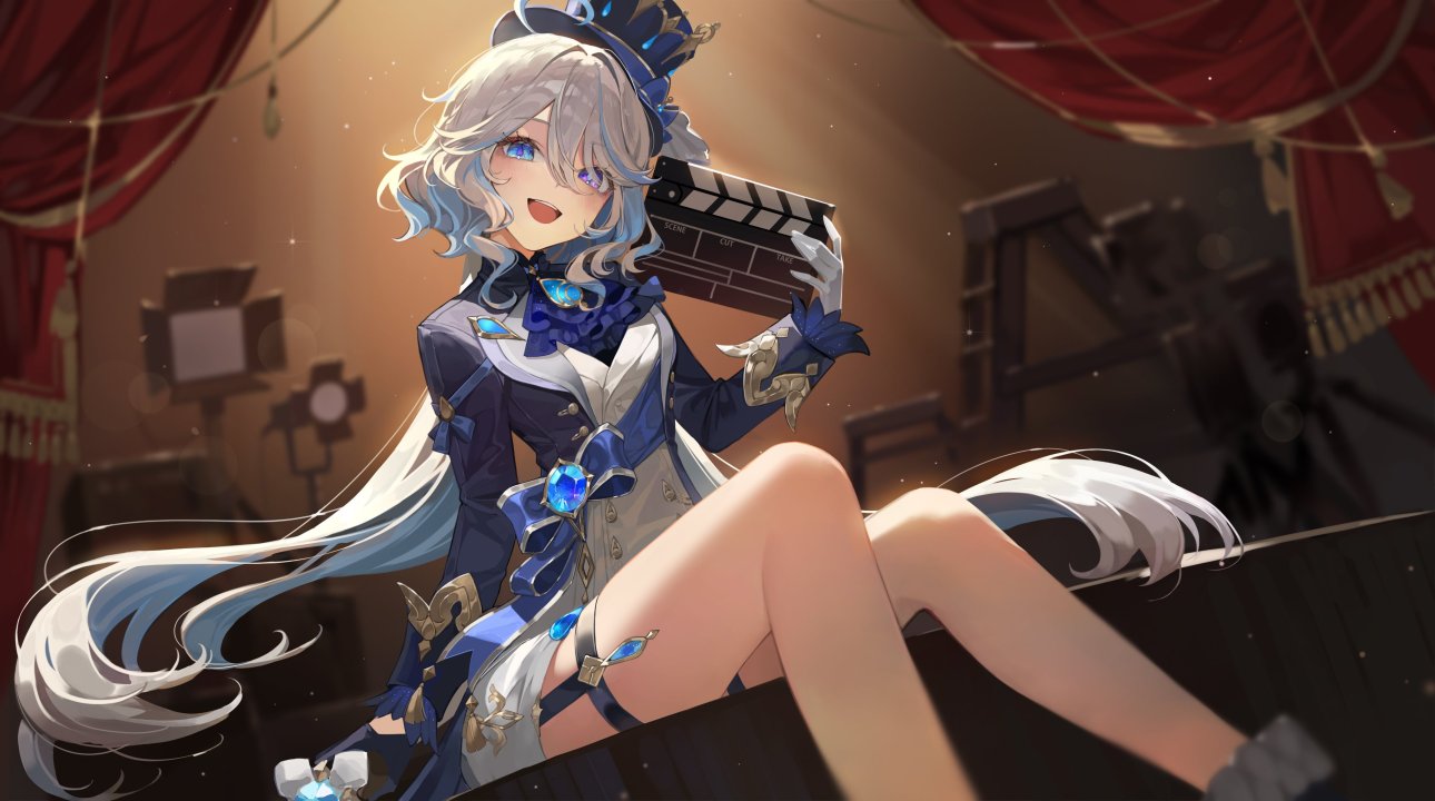 蓝色头发、短发、原神、尤拉、动漫、女孩、发带、鲜花、雪花、高跟鞋、黄色眼睛