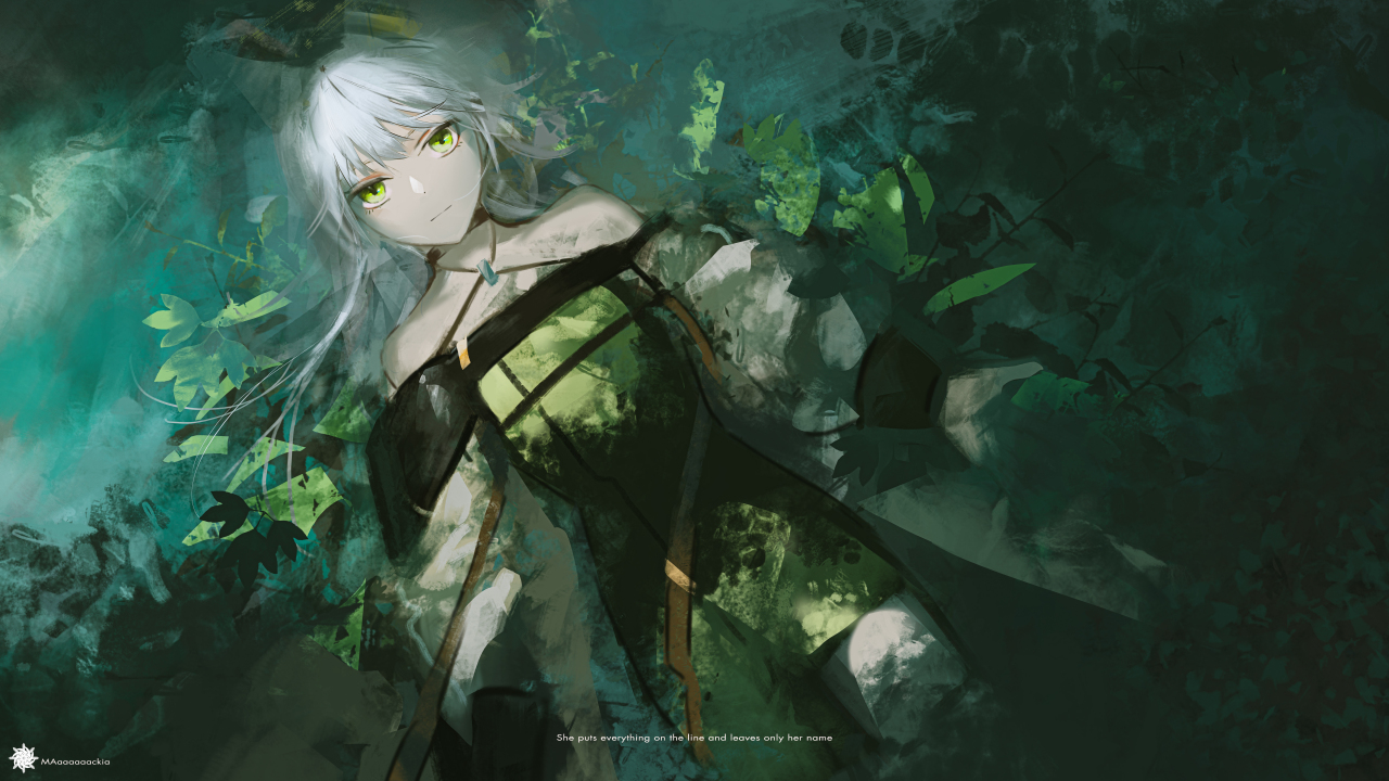 长发、绿色眼睛、白色头发、躺下、仰卧、动漫、动漫女孩、明日方舟、水、水中、树叶