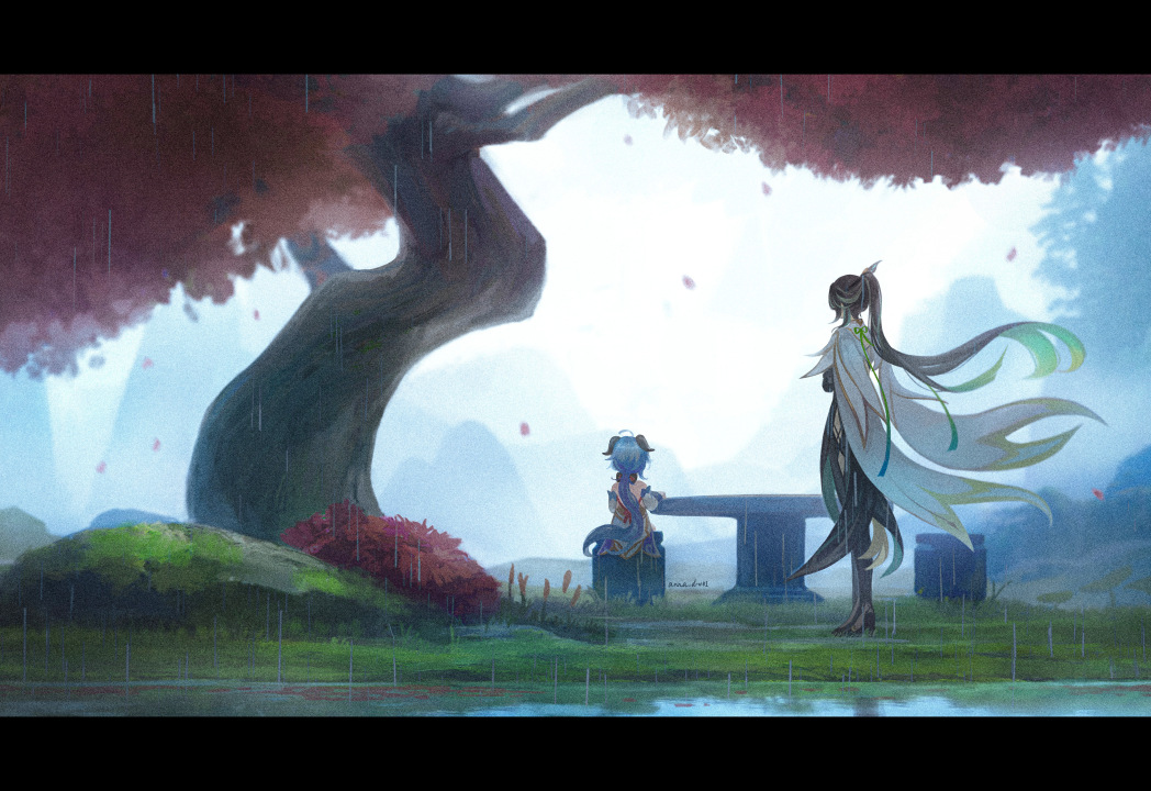 马尾辫、原神、动漫、动漫女孩、树、草、雨