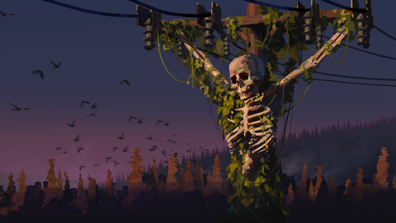 骨架、电线、黎明、鸟类、山脉、数字艺术、电线杆